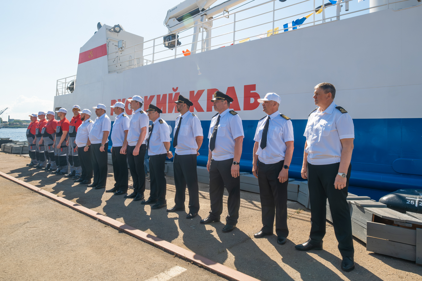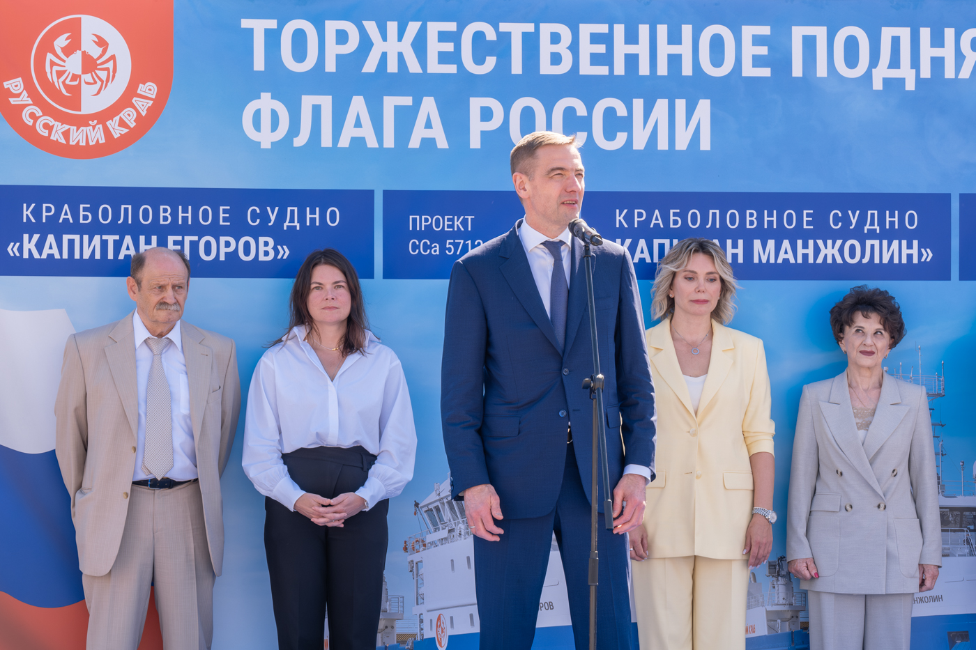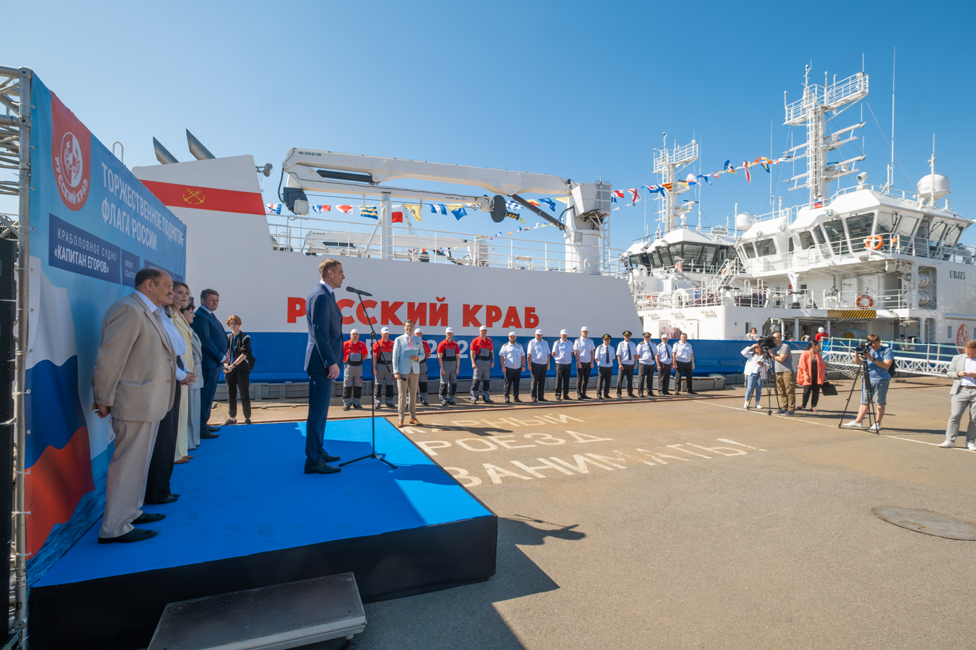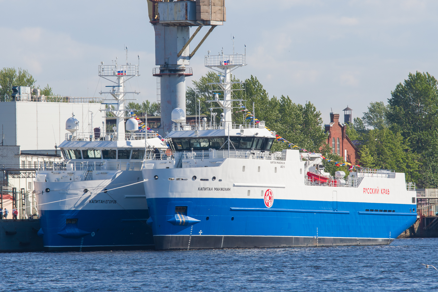 State flag of the Russian Federation has been raised on two new vessels of Russian Crab GC at once. Crab catcher Kapitan Egorov (ССа 5712LS project) and crab processor Kapitan Manzholin (ССа 5712P) were added to the company’s fleet.
